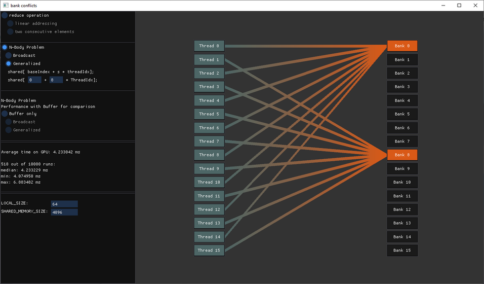 Executes a compute shader to benchmark the impact of bank conflicts. The number of conflict can be configured via the user interface.